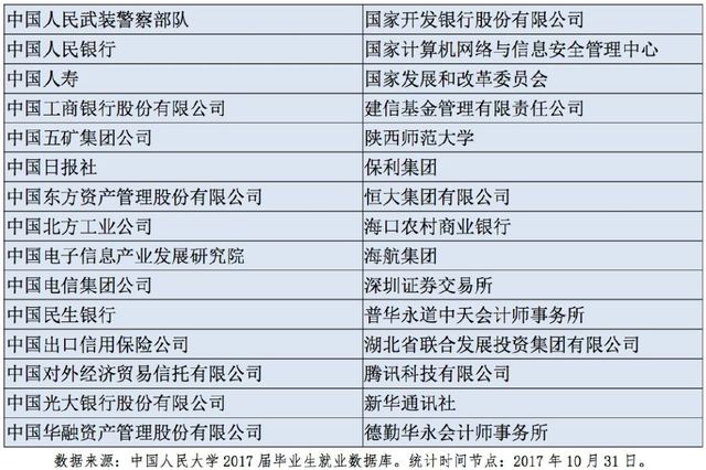 截至目前,未找到國防科技大學、中央民族大學和新疆大學2017年就業質量報告,因此數據中未能統計。部分高校未公布各自畢業生的重點就業單位,因此未能整理畢業生重點就業單位。
