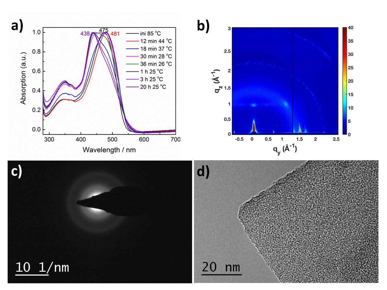 圖2 a) 嵌段共聚物在溶液中隨時間溫度變化的紫外吸收可見光譜,b) 二維正方形膠束GIWAXS衍射圖,c) 二維正方形微納材料的SEAD圖,d) 二維正方微納材料的HRTEM照片