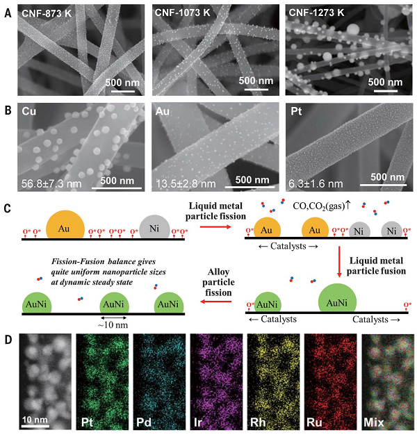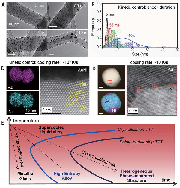 多金屬納米粒子(NMNPs)有著廣泛的應用領域,包括催化,能量儲存和生物/等離子體激元成像。將多種金屬元素合金合成單個納米級產品提供了可能會超過單一元素(或一元)納米粒子材料性能的前景。制備NMNPs的當前和主要途徑來自濕化學合成,可以獲得各種粒度,形狀和相。然而,大多數通過濕化學方法的研究報告中合金組成不超過三種元素,這限制了組成空間。此外,更多的合成技術,包括基于印刷和光刻的方法,已經將組元向四元甚至五元納米結構轉移。