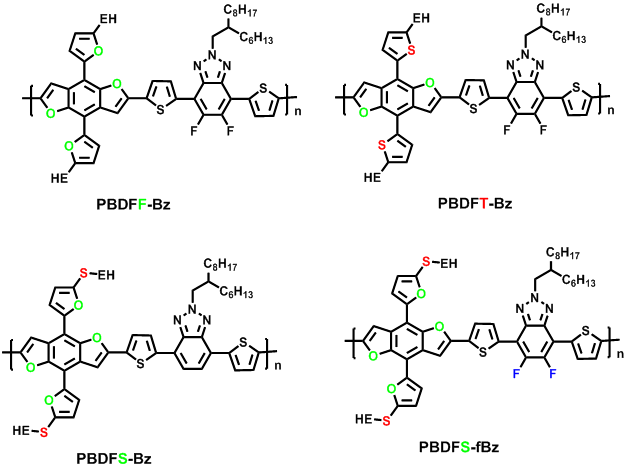 寬帶隙共軛聚合物由于其與當前極具吸引力的窄帶隙非富勒烯電子受體具有互補的吸收光譜,利于實現對太陽光子的最大化利用,因而在最近幾年受到了學術界和產業界的廣泛關注。目前聚合物太陽能電池中大部分高效聚合物太陽電池材料是基于苯并二噻吩(BDT)單元,為實現有機太陽能電池效率的的進一步突破,急需開發基于新設計策略和新構筑單元的聚合物太陽能電池材料。呋喃作為一種與噻吩雜原子同一主族的五元環單元,與噻吩具有類似的化學結構和電子性質。然而,目前對于苯并呋喃等稠環化合物應用于有機太陽能電池領域的研究相對較少。