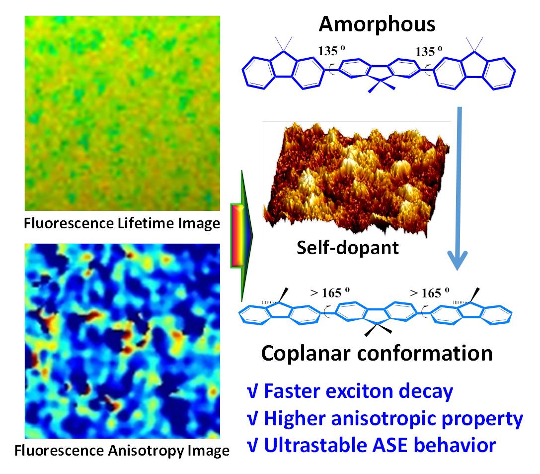 基于前期的設(shè)計(jì)基礎(chǔ),在原有的共平面化構(gòu)象聚二芳基芴主鏈引入不同的螺芴基團(tuán),在保證共平面化構(gòu)象的基礎(chǔ)上提高材料的光電特性。研究結(jié)果表明,位阻功能化的聚二芳基芴呈現(xiàn)高穩(wěn)定性的電致光譜。經(jīng)研究發(fā)現(xiàn),基于螺芴氧雜蒽的聚二芳基芴在提高材料藍(lán)光穩(wěn)定性的同時(shí),具有共平面化構(gòu)象形成能力,呈現(xiàn)超低閾值的受激放大輻射效應(yīng)(ACS Applied Materials & Interfaces, 2017, 9 (43), 37856.)。在此基礎(chǔ)上,系統(tǒng)研究了聚芴無規(guī)和平面化構(gòu)象的光物理和熒光各向異性行為。通過PFO和PODPF的β構(gòu)象薄膜,探索構(gòu)象轉(zhuǎn)變對(duì)于其吸收和發(fā)射光譜,薄膜形貌,發(fā)射衰減行為和熒光各向異性的影響。通過熒光壽命成像(FLIM)測試中直接獲取的二維圖像驗(yàn)證了聚芴平面化構(gòu)象的自摻雜薄膜,且其熒光衰減壽命均低于無規(guī)構(gòu)象的薄膜,首次通過成像直觀呈現(xiàn)聚芴半導(dǎo)體-β構(gòu)象薄膜的自摻雜特性。此外,通過熒光各向異性成像(FAIM)表征顯示β構(gòu)象薄膜由于較高的分子鏈取向而呈現(xiàn)出較高的各向異性。本工作報(bào)道的FLIM和FAIM表征提供了一種有效的途徑探索共軛聚合物構(gòu)象轉(zhuǎn)變的本征光物理過程。