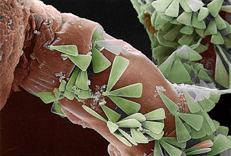 這是一張假色彩顯微鏡圖像,展現的是Loligo pealei魷魚觸角上的吸管盤。這張顯微照片上看,這些吸管盤看上去非常像張著血口、長著鋒利牙齒的外星生物。魷魚吸管盤的直徑為400微米,吸盤管上長的“牙齒”實際上是殼質物。這張圖像是由美國德雷塞爾大學杰西卡·斯徹夫曼和卡羅琳·施勞爾拍攝的。