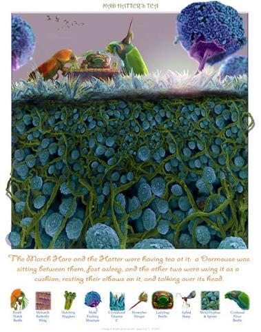 這張圖像的拍攝靈感來源于《愛麗絲漫游奇境》,書中有瘋狂帽先生開茶話會的情節,拍攝者將3只甲蟲和晶體維生素C微觀拍攝有機地結合在一起,再現了《愛麗絲漫游 奇境》中的童年意境。該圖像中晶體維生素C的拍攝者是簡明圖像工作室的克倫·錢姆普和丹尼斯·庫克爾,圖像中3只甲蟲和“空中飛行的鳥類”是由劉易斯·卡羅爾使用顯微鏡 拍攝的。