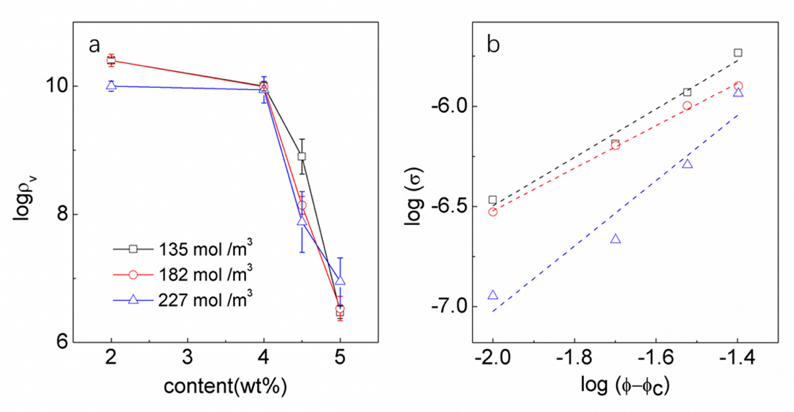 圖 3. PDMS/TNSM2復(fù)合材料的(a)對(duì)數(shù)導(dǎo)電率-填料含量關(guān)系和(b)逾滲特性曲線。(圖片版權(quán)歸American Chemical Society所有)