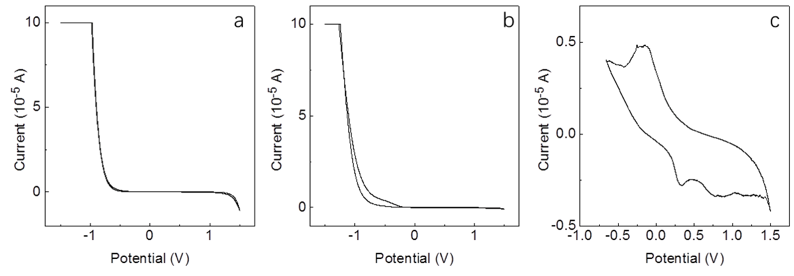 圖 4. (a)PDMS/NC7000,(b)PDMS/TNSM2和(c)PDMS/TNSM3復(fù)合材料的循環(huán)伏安測(cè)試曲線。(圖片版權(quán)歸American Chemical Society所有)