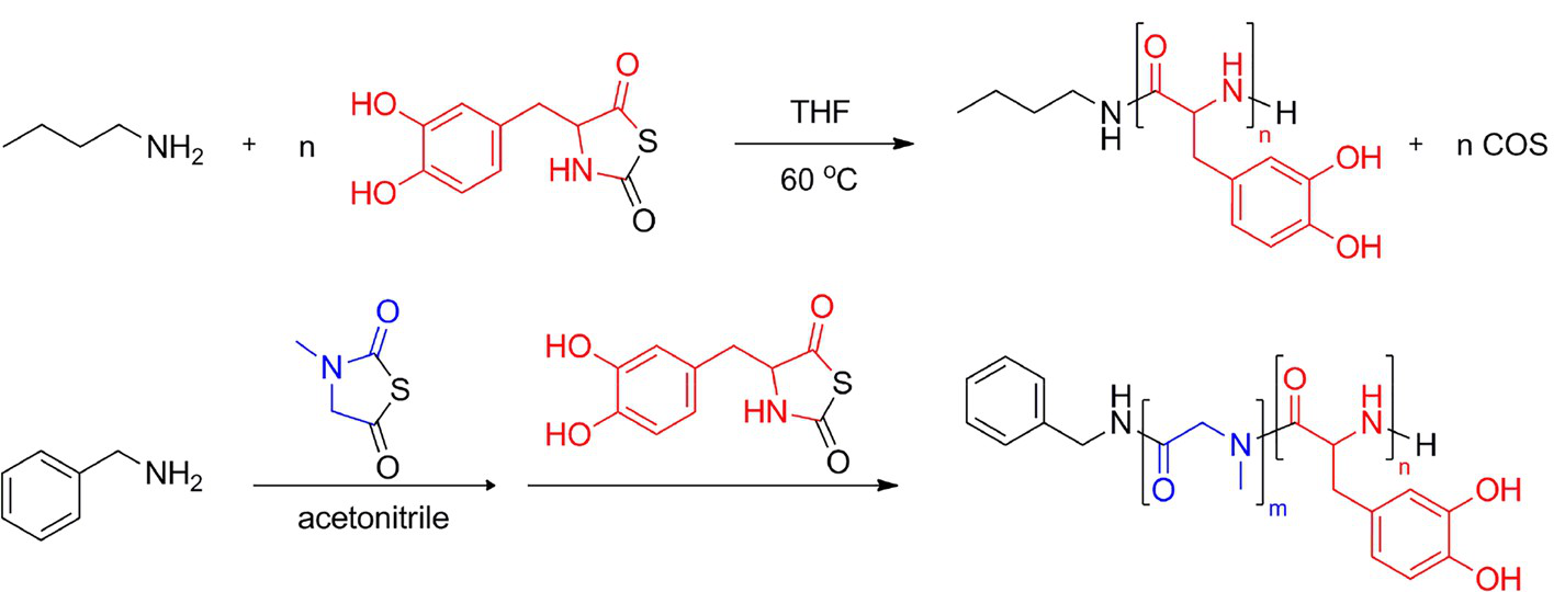 浙江大學凌君教授和孫繼紅教授合作報道了含兒茶酚基的多巴氨基酸-N-硫代羧酸酐(DOPA-NTA)與肌氨酸-NTA(Sar-NTA)可控開環聚合合成了新型含兒茶酚側基的兩親性嵌段聚氨基酸PDOPA-b-PSar。該NTA聚合方法對水不敏感,無需保護酚羥基,聚合產物結構可控。
