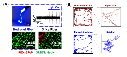 為了解決上述問題,研究團隊合成了具有高導光性的海藻酸鈉-聚丙烯酰胺水凝膠材料,并且在此基礎上制備出了直徑為100-600微米的水凝膠光纖。制備的水凝膠光纖具有優異的光學和力學性能,在空氣中測得的光傳導損失率僅為0.25dB/cm,楊氏模量與神經組織接近(約60kPa),并且能反復拉伸至初始長度的400%以上。借助這種水凝膠光纖,可以穩定地誘發出神經元的特異性相應,并實現對動物行為的控制。此外,與傳統的石英光纖相比,這種水凝膠光纖具有更佳的組織相容性。并且在經過長期的體內埋植后,水凝膠光纖仍能基本保持原有的光學和力學性能。得益于上述特性,團隊研發的水凝膠光纖將為光遺傳技術在脊髓和周邊神經的應用乃至未來的臨床化發展提供重要的技術支持。