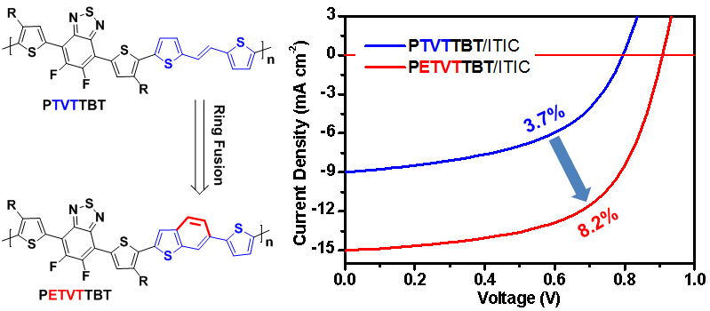 周二軍研究員團隊通過稠合將TVT單元中獨立的雙鍵與鄰近噻吩環稠合,形成ETVT單元,通過電子云結構重構前后的變化,研究噻吩乙烯類聚合物材料結構-能量損失-效率之間的關系。研究發現稠合有利于提高聚合物的光伏性能,降低器件的能量損失。尤其,在基于ITIC的非富勒烯聚合物太陽能電池中,稠合后的聚合物光電轉換效率提高了一倍以上,如圖2所示,能量損失從典型的0.8 eV降低到了0.67 eV,如圖1所示。