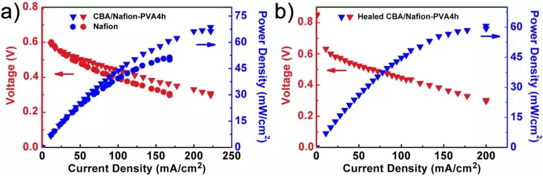 在電池性能的測試中,該自修復(fù)質(zhì)子交換膜同樣展現(xiàn)出了比Nafion膜更優(yōu)異的性能,其最高能量密度和最高電流密度分別達(dá)到68.7 mW/cm2和222 mA/cm2。重要的是,該自修復(fù)質(zhì)子交換膜可以在80 oC的2 M的甲醇溶液中修復(fù)貫穿整個膜的機(jī)械損傷并恢復(fù)原有的甲醇阻隔能力以及電池性能。需要強(qiáng)調(diào)的是,該膜的修復(fù)條件是甲醇燃料電池的工作條件,這意味著一旦損傷發(fā)生,該膜可以在工作狀態(tài)下自發(fā)修復(fù)損傷。