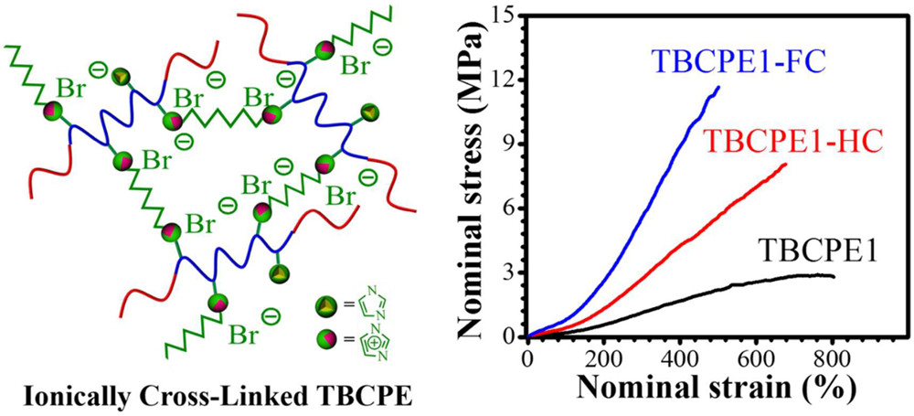 圖1. (Left) Ionically cross-linked TBCPE. (Right) Monotonic nominal stress-strain curves for TBCPE1, TBCPE1-HC, and TBCPE1-FC. (Macromolecules 2017, 50 (16), 6218–6226)