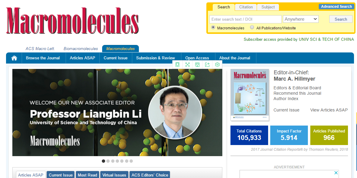 近日,中國科學(xué)技術(shù)大學(xué)國家同步輻射實(shí)驗(yàn)室李良彬教授應(yīng)邀擔(dān)任國際著名學(xué)術(shù)期刊Macromolecules副主編(Associate Editor)。Macromolecules是美國化學(xué)會(huì)(American Chemical Society, ACS)主辦,國際上高分子專業(yè)領(lǐng)域的頂尖學(xué)術(shù)期刊,是高分子學(xué)科唯一入選Nature Index的期刊。李良彬教授此次任職Macromolecules雜志副主編,成為該雜志1968年創(chuàng)刊以來擔(dān)任副主編的第一位中國大陸學(xué)者。