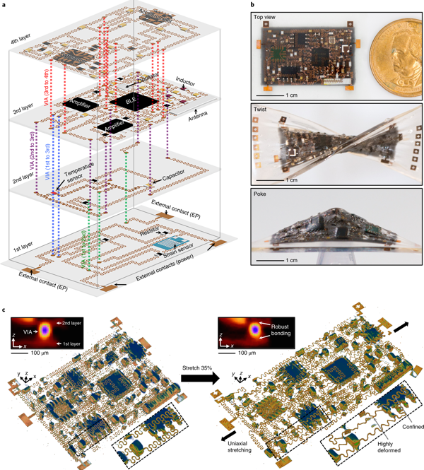 研究人員說,電路板采用以硅彈性體為基礎的“島-橋”結構,其中“島”是剛性的小型電子器件,如傳感器、天線、藍牙芯片等;“橋”是可拉伸的銅線,用來連接“島”,使電路板可以伸縮彎曲而不影響其功能。