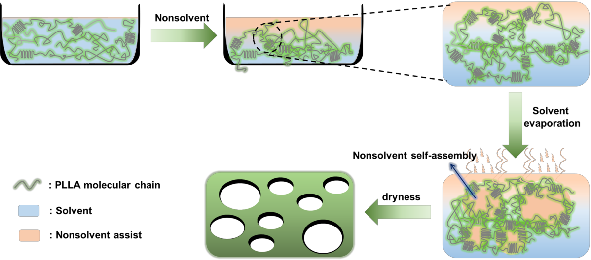 圖1. 溶劑蒸發誘導相分離法制備PLLA多孔材料的示意圖