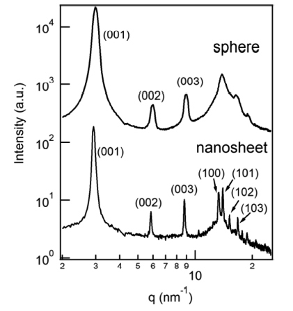 PEG112-b-PNOG54的sphere和nanosheet結構面內GIWAXS圖。