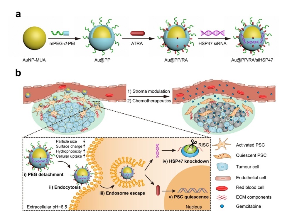 胰腺癌惡性程度高、預后極差,被稱為“癌中之王”。胰腺癌微環境具有高度纖維化、過度結締組織增生及嚴重乏血供等特殊病理特點,極大地阻礙了臨床一線化療方案的有效實施。激活的PSC大量分泌膠原、纖連蛋白以及基質金屬蛋白酶等細胞外基質,是胰腺癌微環境基質的主要來源;并通過與胰腺癌細胞共同構建的調控網絡,在胰腺癌發展、轉移、耐藥和免疫逃逸等方面發揮促進作用,是胰腺癌微環境調控的重要靶點。該工作構建了一種表面修飾聚乙二醇的陽離子金納米體系,同時遞送PSC調控藥物及降低基質分泌的siRNA。體系設計中引入了腫瘤微環境低pH響應的聚乙二醇脫除機制,能夠在保證其體內輸運穩定性的同時,提高癌細胞的藥物攝取和siRNA的轉染效率。在胰腺癌患者來源的PSC中,該納米體系能夠促進活化的PSC重返靜息狀態,從而抑制其分泌多種細胞外基質,在胰腺癌細胞/PSC共接種的小鼠胰腺癌皮下腫瘤和原位腫瘤模型中,該納米體系均實現了對PSC異;罨癄顟B的高效逆轉;通過對微環境基質代謝的綜合調控,顯著增加藥物在腫瘤內的輸運效率,提高胰腺癌的化療效果。該研究利用納米藥物體系實現了基于PSC靜息的胰腺癌微環境穩態調控,為更廣泛的基質纖維化腫瘤的治療提供了新的思路。