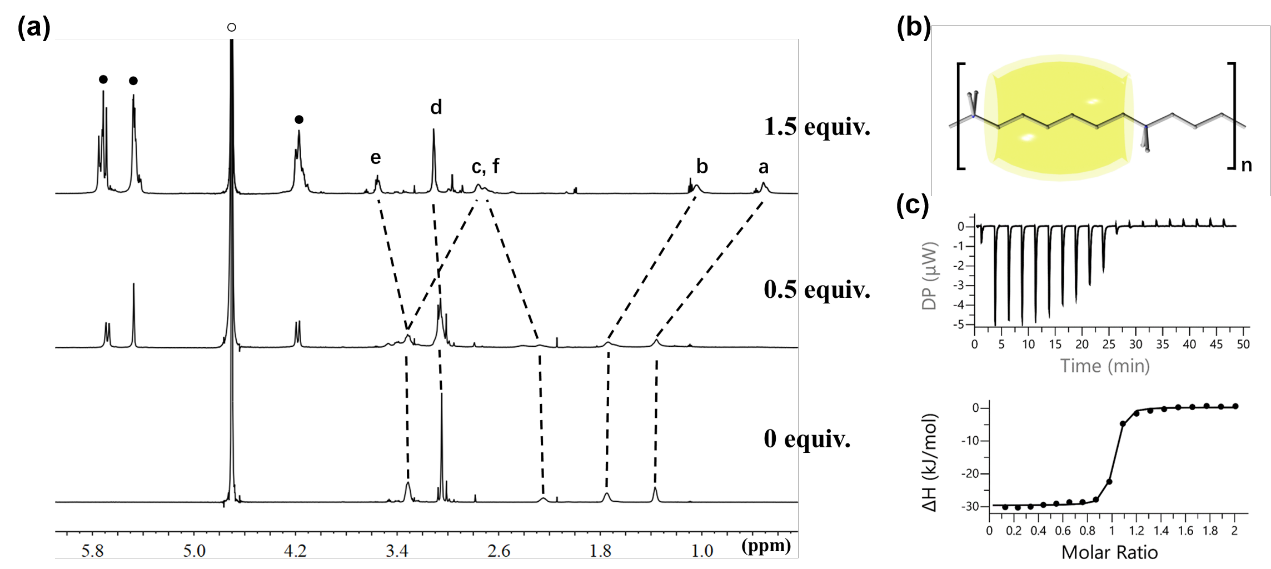 圖2. (a) 0 mM的聚凝胺在用0, 0.5, 1.5當量的CB[7] 滴定時的1H NMR圖。(b) HB@CB[7]形成準輪烷的示意圖. (c) 等溫滴定量熱法熱譜圖(上),滴定過程中的焓變曲線圖(下)。