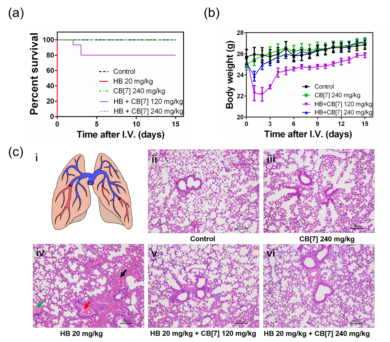 圖4. (a) 小鼠尾靜脈注射聚凝胺及聚凝胺和CB[7]復合物后的生存曲線圖。(b) 小鼠尾靜脈注射聚凝胺及聚凝胺和CB[7]復合物后的體重圖。(c) 肺部栓塞示意圖(i) 和小鼠肺部H&E切片(ii-vi)。