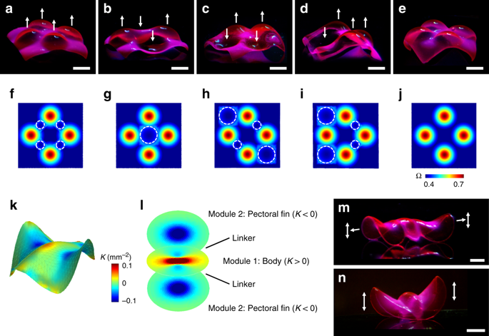 研究人員還開發了基于模塊化概念的設計規則,以創建更復雜的結構,包括具有編程順序運動的仿生結構,這使得形狀更為動態以便在空間中移動。研究人員還可控制結構改變形狀的速度,從而創建出更為復雜的類似于魚兒水中游的連續運動。