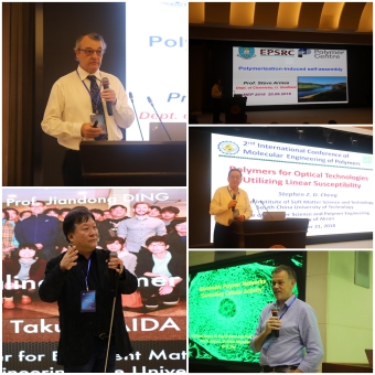 復旦大學楊玉良院士、香港科技大學唐本忠院士、中科院化學所劉云圻院士、復旦大學江明院士分別主持了大會報告。會議特邀的4位大會報告人分別是:(1)日本東京大學的杰出教授Takuzo Aida (相田卓三),高分子和超分子新材料和新興物質科學領域十分有感染力和創造力的學者,他作了題為“Non-equilibrated supramolecular chemistry and materials science”的大會報告;(2)英國皇家學院院士、謝菲爾德大學的Steven P. Armes教授,他是國際高分子化學方面的名家,作了題為“Polymerization-induced self-assembly”的大會報告;(3)美國工程院院士、阿克隆大學Stephen Z. D. Cheng(程正迪)教授,作了題為“Polymers for optical technologies utilizing linear susceptibility”的大會報告;(4)澳大利亞AIBN生物工程和納米技術研究所所長、澳大利亞昆士蘭大學Alan Rowan教授,他在仿細胞骨架纖維非線性力學行為的合成高分子方面有獨到研究,作了題為“Biomimetic polymer networks  a key to controlling Cell Fate”的大會報告。