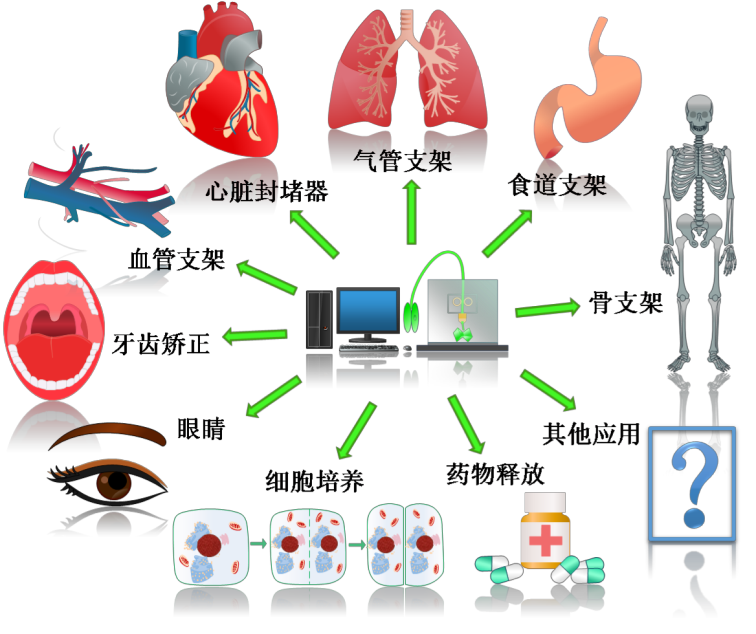 哈爾濱工業大學冷勁松教授研究團隊對4D打印形狀記憶聚合物在生物醫療領域的國內外研究進展進行全面而系統的綜述。他們首先對形狀記憶聚合物材料的響應機理及形變激勵條件(如溫度、濕度、電場、磁場、pH等)進行了解析,也對4D打印原理進行了闡述,同時詳細介紹了4D打印形狀記憶聚合物在生物醫療領域的實例和應用價值,包括血管支架(圖1)、氣管支架、細胞支架、骨支架、心臟支架、乳房支架、仿生肌肉等。該團隊還總結了4D打印形狀記憶聚合物在生物醫療領域的應用前景(圖2)、最后,該團隊對目前4D打印形狀記憶聚合物在生物醫療領域存在的問題進行了探討,并對其未來發展方向進行了展望。