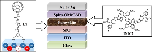 近年來,有機無機雜化鈣鈦礦材料因其吸收系數(shù)高、雙極性電荷傳輸、載流子擴散距離和壽命長、可溶液加工、廉價等特點引起了學術界的廣泛關注。基于這類材料的太陽能電池的光電轉(zhuǎn)換效率從最初的3.8%迅速提升至23.3%。然而,鈣鈦礦太陽能電池仍然面臨穩(wěn)定性和毒性等問題。利用含有官能團的有機半導體材料對界面修飾或?qū)︹}鈦礦層摻雜,能有效抑制鈣鈦礦太陽能電池的遲滯現(xiàn)象,改善鈣鈦礦薄膜質(zhì)量,減少鈣鈦礦體相和界面缺陷,從而提升器件光伏效率和穩(wěn)定性。