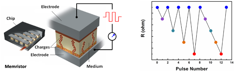 圖2.(左)憶阻器結構、工作原理以及(右)電阻轉變示意圖