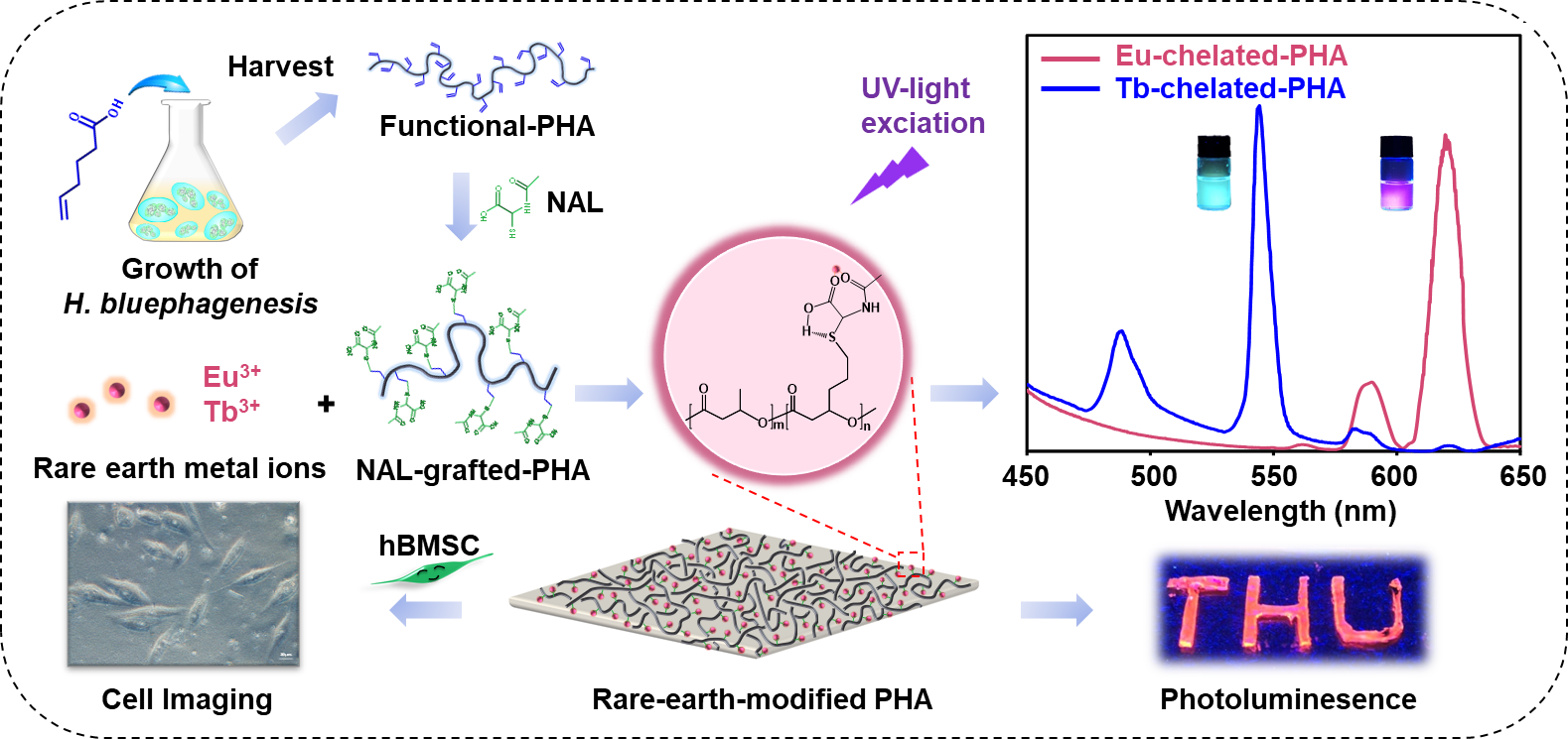 該項研究著眼于具有發展前景的Halomonas菌株,成功在其中構建了合成中長鏈功能PHA(Functional-PHA)的代謝通路,純化得到的功能PHA在其側鏈上帶有不飽和雙鍵,在此基礎上通過巰烯點擊化學反應接枝了半胱氨酸側鏈基團,得到接枝PHA(NAL-grafted-PHA),隨后利用半胱氨酸上的羰基進行配位作用,將兩種稀土離子(銪離子和鋱離子)成功捕獲在接枝PHA的側鏈上,獲得了一類新型的稀土PHA材料(Rare-earth-modified PHA ),分別為銪離子鰲合的PHA(Eu-chelated-PHA)和鋱離子鰲合的PHA(Tb-chelated-PHA)。