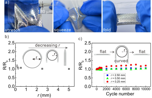 圖1、a) PVA封裝的液態金屬圖案的拉伸、擠壓和折疊機械形變。b-c) 不同彎曲半徑下的電路電阻變化及其疲勞測試結果。