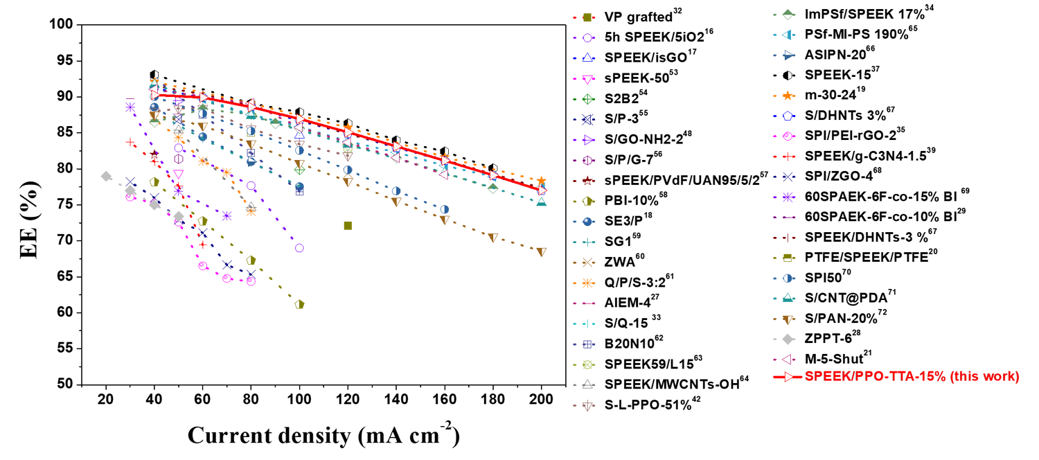 該團隊進一步對所制備的新型兩性離子交換膜的電池性能進行了測試并與常用的Nadion 212和SPEEK膜以及近些年報道的其余類型的兩性膜和SPEEK基質膜進行了對比。研究結果表明,隨著叔胺基團含量的增加,由于基于酸堿對結構和高效氫鍵網絡的高性能親水離子通道的建立,所制備的多叔胺型兩性離子交換膜所組裝電池在保持了優異的電壓效率(VE)的同時其庫倫效率(CE)和能量效率(EE)獲得了顯著提升。在40~200 mA?2電流密度下,共混比為15%的兩性離子交換膜組裝的電池CE和EE分別可達94.3%~98.3%和90.3%~77.1%,并且經過200次循環后沒有明顯降低。其性能遠優于Nafion 212膜以及原始的SPEEK膜,并且在近年來報道的兩性膜以及SPEEK基質膜中處于很高水平。該工作為離子交換膜傳導率和選擇性的平衡以及其高性能親水離子通道的設計提供了新的策略。