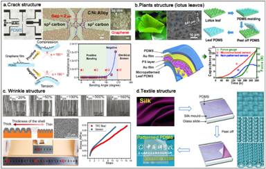 圖2、基于(a)納米碳材料裂紋結(jié)構(gòu)、(b)荷葉表面微納結(jié)構(gòu)、(c)“wave”延展結(jié)構(gòu)、(d)織物微納結(jié)構(gòu)組裝的仿生柔性傳感器。