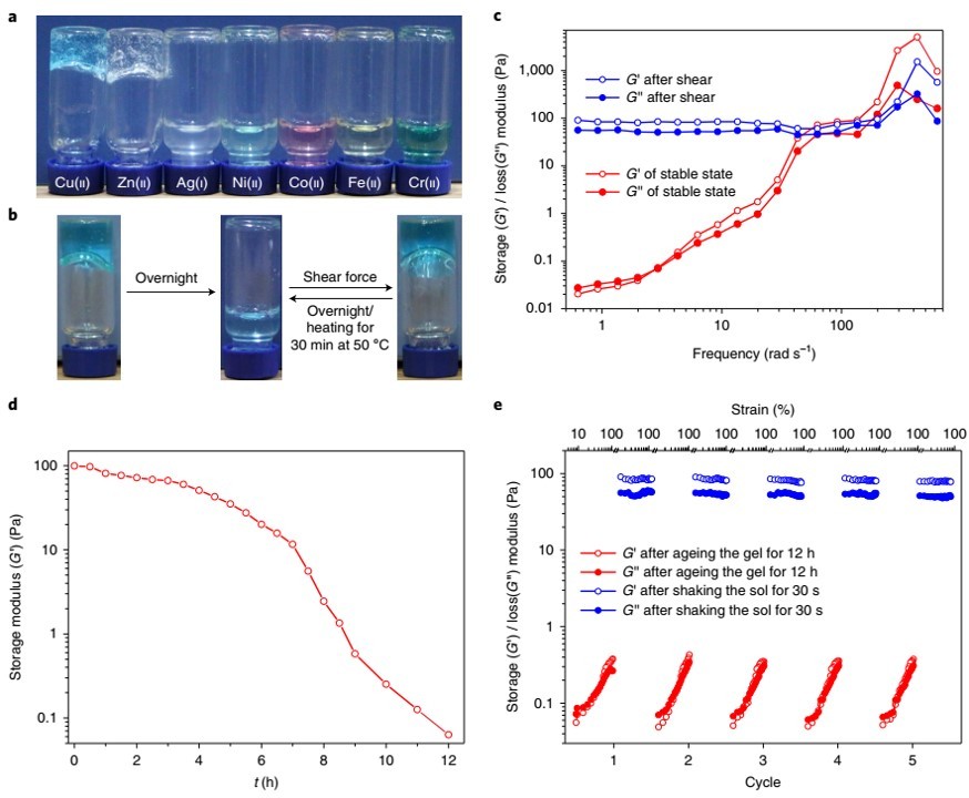 在已報到的一些人工合成的耗散自組裝系統中,材料通常表現出較差的機械性能。南方科技大學的蔣偉教授課題組在最新一期的Nature Chemistry報告了一種通過施加剪切力誘導的瞬態水凝膠。該材料具有高度的可拉伸性能和自修復性能。作者使用聚乙二醇通過氫鍵作用穿插聚呋喃輪烷構筑長鏈的管狀高分子結構,并通過加入Cu(ii)作為高分子配位位點,從而實現材料的構筑。