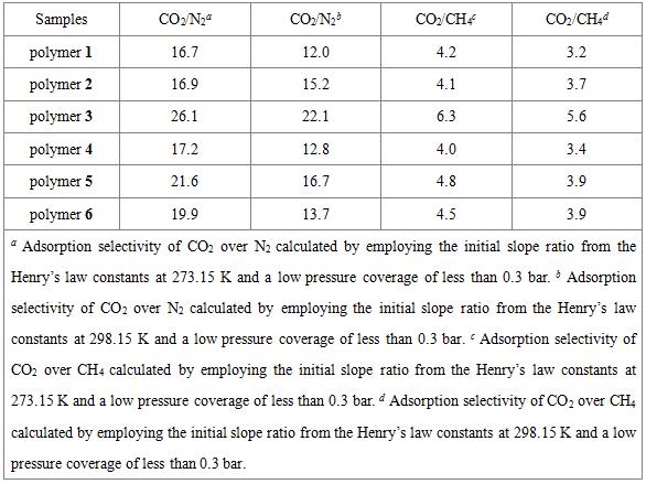表3. 273.15和298.15 K下聚合物的氣體吸附選擇性