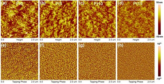 Figure 4. AFM height images (a-d) and phase images (e-h) of the polymer:Y6 blends.