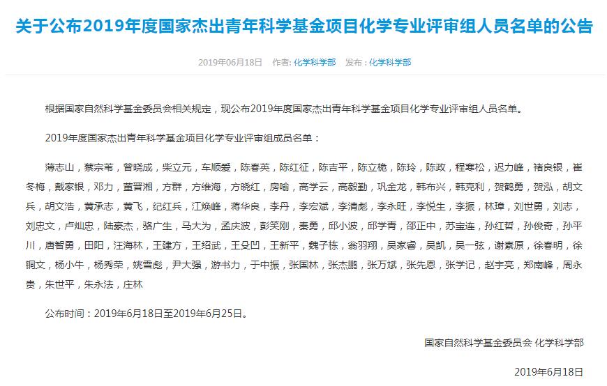 2019年度國家杰出青年科學基金項目化學專業評審組人員名單公布