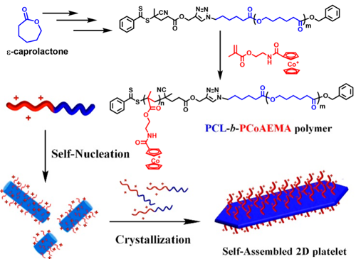圖2. 二茂鈷基金屬聚電解質(zhì)嵌段共聚物的合成和結(jié)晶誘導自組裝