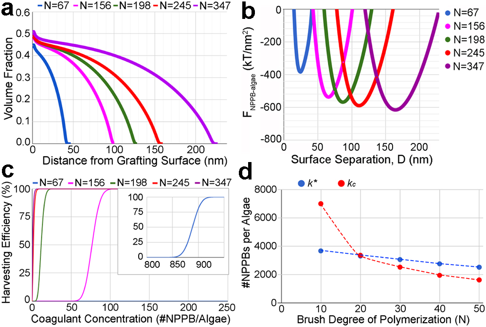 梁紅軍教授還與科羅拉多礦業(yè)學(xué)院 David Wu教授合作將實(shí)驗(yàn)與理論計(jì)算相結(jié)合, 首次利用DLVO和自洽場(chǎng)模型 (SCFT)理論分別模擬微藻的膠體穩(wěn)定性和高分子刷的動(dòng)態(tài)響應(yīng),揭示了NPPB與傳統(tǒng)的鏈狀高分子絮凝劑在調(diào)節(jié)藻類間電位方面的根本性區(qū)別 (圖3)。實(shí)驗(yàn)和模型分析均揭示了一個(gè)引發(fā)微藻凝聚的最小高分子刷鏈長(zhǎng)和最優(yōu)鏈長(zhǎng)的存在,超出此范圍增加鏈長(zhǎng)帶來(lái)的好處會(huì)迅速減弱。此外,除了電荷相互作用, NPPBs上的高分子刷還可以設(shè)計(jì)為其他類型的吸引力,如氫鍵,離子橋和化學(xué)配位等。其團(tuán)隊(duì)預(yù)計(jì)“可收集,可回收,可重復(fù)使用”的NPPB概念不僅有助于釋放基于藻類對(duì)生物燃料的巨大潛力,并將有益于其他領(lǐng)域內(nèi)涉及到浮游單細(xì)胞捕獲和分離,以及合理控制利用膠體穩(wěn)定性的應(yīng)用(例如,3D打印油墨,光子晶體等)。