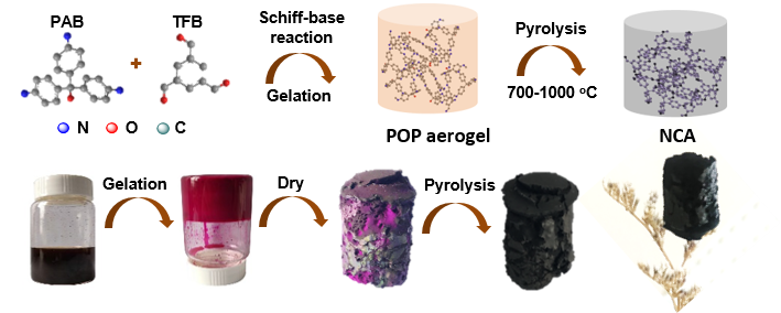 針對(duì)這些挑戰(zhàn),東華大學(xué)纖維材料改性國(guó)家重點(diǎn)實(shí)驗(yàn)室廖耀祖教授團(tuán)隊(duì)以低廉的工業(yè)產(chǎn)物副品紅堿和均苯三甲醛為原料,借助簡(jiǎn)單的席夫堿反應(yīng),通過(guò)反復(fù)試驗(yàn)篩選溶劑類(lèi)型、調(diào)控單體濃度及反應(yīng)溫度,設(shè)計(jì)合成富氮有機(jī)多孔聚合物納米球凝膠(ACS Appl. Energy Mater. 2018, 1, 6535)。聚合物自身存在的超交聯(lián)結(jié)構(gòu)、豐富的內(nèi)部氫鍵作用以及納米球之間的點(diǎn)對(duì)點(diǎn)接觸,賦予其較高的比表面積、良好的機(jī)械強(qiáng)度和熱穩(wěn)定性能。通過(guò)簡(jiǎn)單的高溫?zé)崽幚恚簧婕俺R界或冷凍干燥過(guò)程,一步法成功地制備了一種新型氮摻雜炭氣凝膠(nitrogen-doped carbon aerogel,簡(jiǎn)稱(chēng)NCAs)。