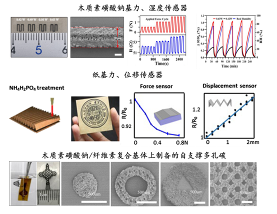 2. 利用價格低廉、環(huán)境友好、來源豐富的木質(zhì)素磺酸鈉、纖維素紙作為碳化前驅(qū)體,由此開發(fā)了激光直寫生物質(zhì)碳基傳感材料,敏感系數(shù)達到~180。進一步結(jié)合紙容易裁剪、折疊、可3D塑形的特點,獲得具有可調(diào)剛度結(jié)構(gòu)的多功能力敏傳感器(Cellulose, 2019,26,7423–7435;Ind. Eng. Chem. Res, 2019, 58, 24, 10364-10372)。此外,利用激光直寫木質(zhì)素磺酸鈉/纖維素復合紙制備多孔碳結(jié)構(gòu),進一步與水浸潤結(jié)合可以實現(xiàn)碳小片從基材上自發(fā)脫除,由此獲得尺寸均一、形狀任意的自支撐碳小片。這種制備靈活的多孔碳小片有望應用于染料吸附、柔性傳感器、超級電容器等領(lǐng)域(ACS Omega, 2019, 4, 5870?5878)。