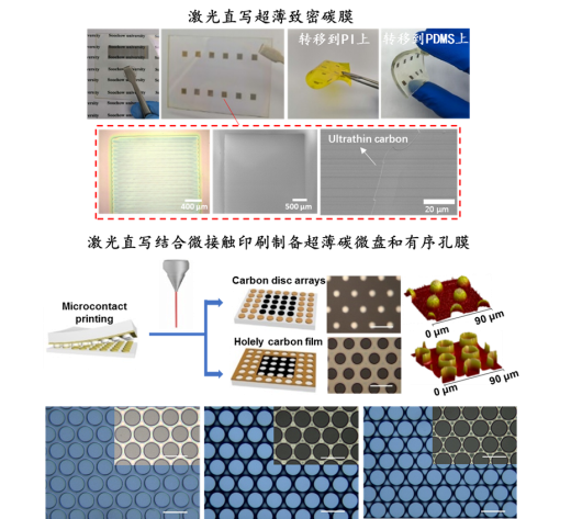 圖3.激光直寫的超薄致密碳膜;激光直寫結(jié)合微接觸印刷制備的納米厚度碳微片陣列和有序孔洞碳薄膜。