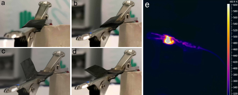 當前SMPI主要通過直接加熱的方式實現形狀記憶驅動,而在微電子、航空航天等應用中,直接加熱較為不便或難以實現。因此,便捷可靠的遠程驅動對SMPI具有重要意義。電驅動是形狀記憶聚合物常用的遠程驅動方法,但已知電驅動形狀記憶聚合物多為中低溫材料,其玻璃化轉變溫度(Tg)通常低于200 oC。哈爾濱工業大學肖鑫禮課題組與北京市射線應用研究中心王連才研究員合作,采用研磨碳纖維增強的方式在國際上首次研制出Tg 為302 oC的電驅動形狀記憶聚酰亞胺(Electro-active SMPI, EASMPI),在15.9 V電壓下即可實現形狀的遠程驅動,其過程如圖1所示。從其溫度分布圖中可以看出,此時EASMPI的溫度超過330 oC。