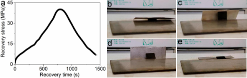 回復應力是形狀記憶材料在受限回復時產生的應力,其大小是決定實際應用的重要指標。與目前廣泛應用的形狀記憶合金相比,較小的回復應力是限制形狀記憶聚合物實際應用的一個主要原因。文獻報道的形狀記憶聚合物回復應力通常在4~10 MPa,而 EASMPI由于研磨碳纖維的增強作用,其回復應力可達 40.1 MPa。高回復力使EASMPI在322 oC形狀回復時可推動為其自身重量30多倍的不銹鋼金屬板,如圖2所示。