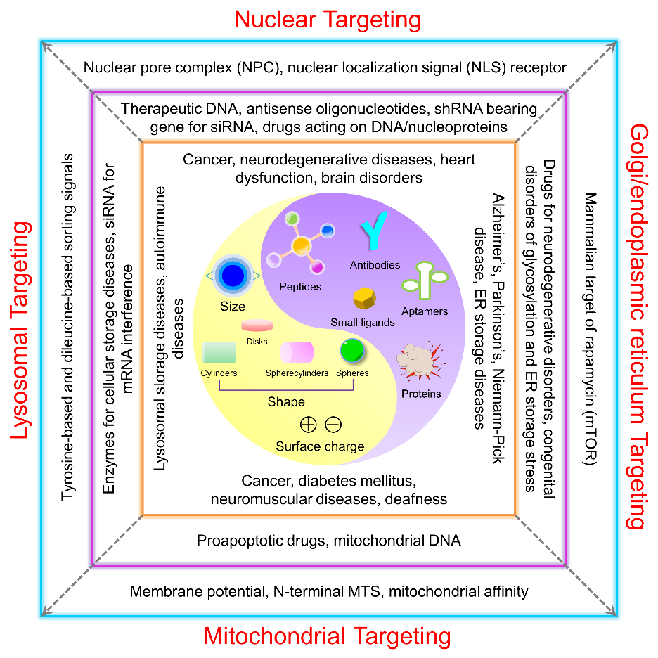 圖1 具有各種生物物理化學特征的納米粒子用于亞細胞靶向。橙色框代表與細胞器相關的疾病,紫色框代表以細胞器為靶點的藥物,藍色框代表用于亞細胞靶向的序列。