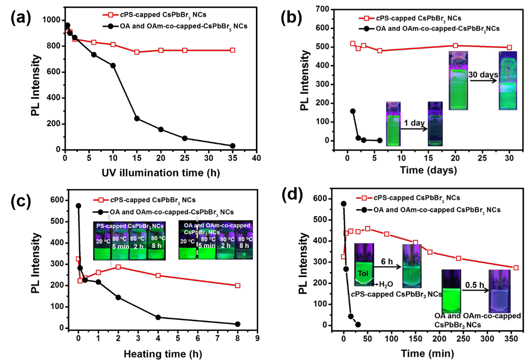 圖2. cPS-capped CsPbBr3 NCs 和OA- and OAm-co-capped CsPbBr3 NCs 熒光強(qiáng)度隨時(shí)間的變化:(a)UV 輻照;(b)室溫下30天存儲(chǔ)(暴露于60 %的濕度和空氣中);(c)加熱到80℃;(d)加入水(10 %)。
