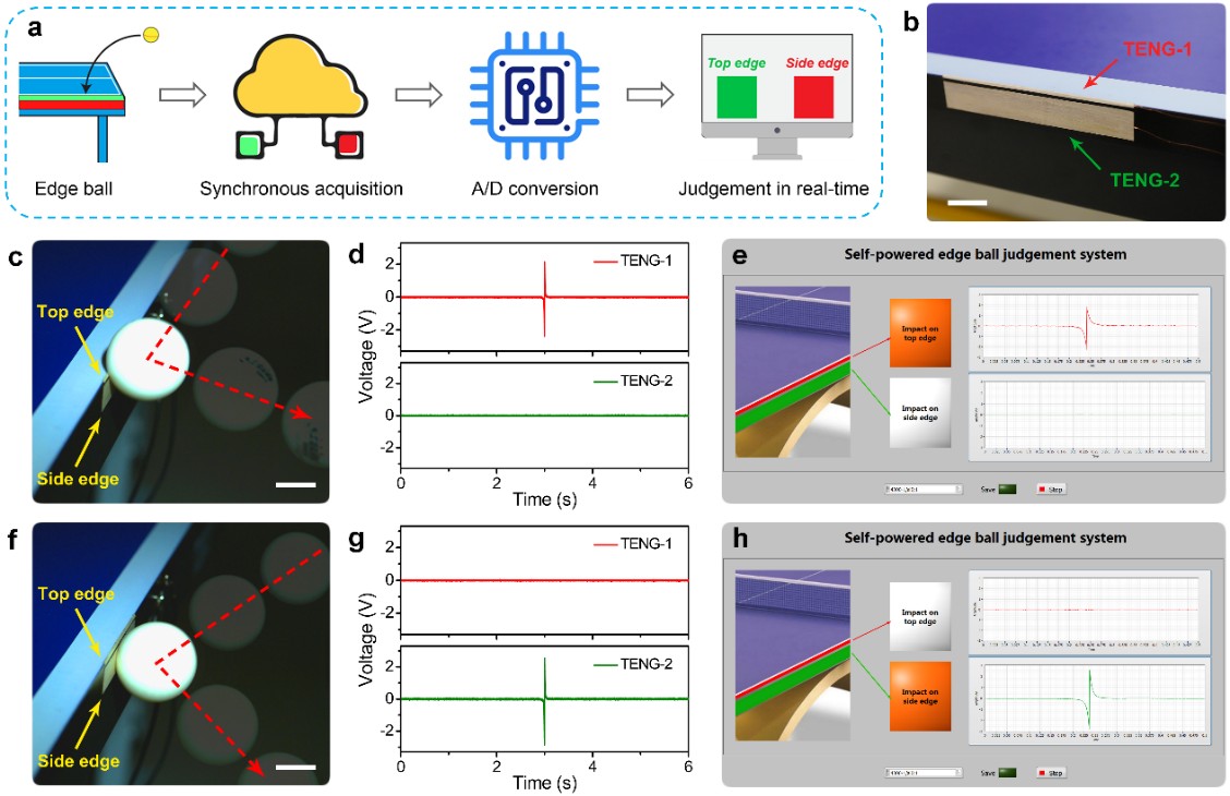 近期,中國科學(xué)院北京納米能源與系統(tǒng)研究所王中林院士課題組聯(lián)合普渡大學(xué)的范鳳茹博士,報道了一種具有良好柔性、耐久性的高性能木基摩擦納米發(fā)電機(jī)(W-TENG)。經(jīng)過簡單有效的木材處理方法,木材的摩擦發(fā)電性能和機(jī)械性能(包括強(qiáng)度、柔韌性、耐磨性和可加工性能等)都大幅提高。用改性木材制備得到的W-TENG,其輸出性能也提升了~70%。同時,這種W-TENG還擁有質(zhì)量輕(0.19 g)、結(jié)構(gòu)薄(0.15 mm)、價格低等優(yōu)點(diǎn)。基于上述優(yōu)良的性能,這種W-TENG還被用作自驅(qū)動傳感器構(gòu)建具有多種傳感功能的智能乒乓球臺,利用乒乓球撞擊球臺產(chǎn)生的機(jī)械能設(shè)計(jì)了一種自驅(qū)動落點(diǎn)分布統(tǒng)計(jì)系統(tǒng)和插邊球判定系統(tǒng)。該自驅(qū)動系統(tǒng)可同時實(shí)現(xiàn)乒乓球的速度傳感、路徑追蹤和落點(diǎn)分布統(tǒng)計(jì),記錄的完整數(shù)據(jù)可用于大數(shù)據(jù)分析,給運(yùn)動員的訓(xùn)練提供有效的評估和指導(dǎo);而且還能準(zhǔn)確的判定兩種不同的擦邊球,可以輔助裁判員在比賽中做出準(zhǔn)確的判罰。這項(xiàng)研究拓展了自驅(qū)動系統(tǒng)在智能體育設(shè)備和體育大數(shù)據(jù)分析中的應(yīng)用,開辟了木基電子器件與自驅(qū)動系統(tǒng)相結(jié)合的創(chuàng)新研究方向。該研究可以延伸到多種體育運(yùn)動,例如跳遠(yuǎn),籃球,羽毛球,網(wǎng)球,排球等多項(xiàng)體育運(yùn)動的智能分析。