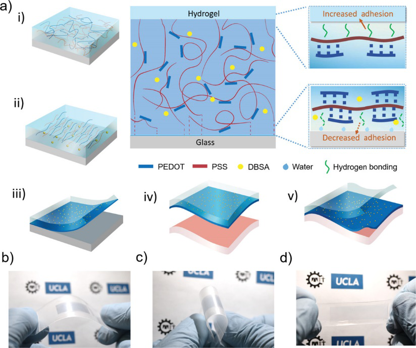 針對上述問題,加州大學洛杉磯分校(UCLA)的Ali Khademhosseini教授和Shiming Zhang (張世明) 博士等研究者提出了一種基于水凝膠載體的轉移印刷新方法。該方法可將在傳統的玻璃襯底上加工處理后的PEDOT:PSS薄膜轉印到柔性襯底上,為制備超薄、可穿戴、以及皮膚可貼附有機生物電子器件提供了一種新的策略。