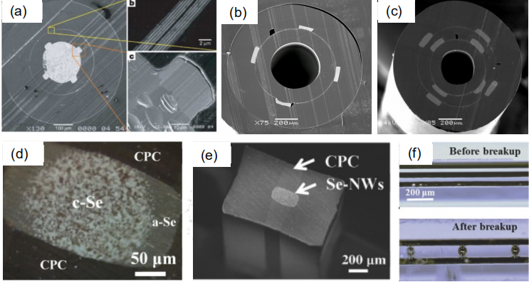 制備集成多材料和復雜結構的光纖電子纖維器件在工藝上具有挑戰性。以熱拉制為核心的典型工業生產方法應運而生。文章列出了熱拉制纖維歷史發展的代表性作品。此方法集成了具有不同光學、電子和光電子特性的不同材料,在宏觀預制棒內設計結構,然后通過將預制棒熱拉制成纖維,使纖維保持預制棒的復雜結構和和功能,從而得到具有高密度器件和各種功能的纖維。