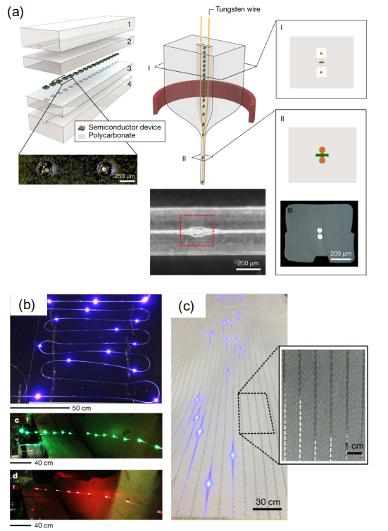 此外,多材料纖維還可以作為3D打印的墨水,可以將具有不同物理性質的材料很好地結合在一起,打印到器件中(如圖12)。通過這種方法,可以構造出任何形式的三維結構來展示設備的功能。