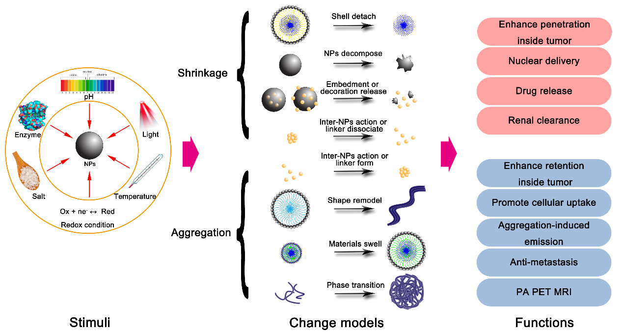 該綜述通過“由大變小“和”由小變大”兩個方面對現有粒徑變化策略進行總結,每部分又根據響應刺激的不同,分別從內源性刺激(酶,pH,GSH)和外源性刺激(光,溫度,活性氧)展開來介紹 (圖1)。受到相關刺激后的納米粒可以通過一系列自組裝,靜電相互作用,相變,形狀變化等,發生智能性的粒徑改變,從而增加在腫瘤組織中的深層穿透和滯留,增強抗腫瘤效果。此外,粒徑變化后的納米粒往往具有不同的理化性質,其在實時腫瘤成像,改變腫瘤微環境以及細胞核遞藥中的應用也進行了介紹。綜述的最后還對目前該遞藥系統存在的挑戰以及未來的潛在應用進行了詳細而全面的討論,為以后的研究方向提供了一定的思路。