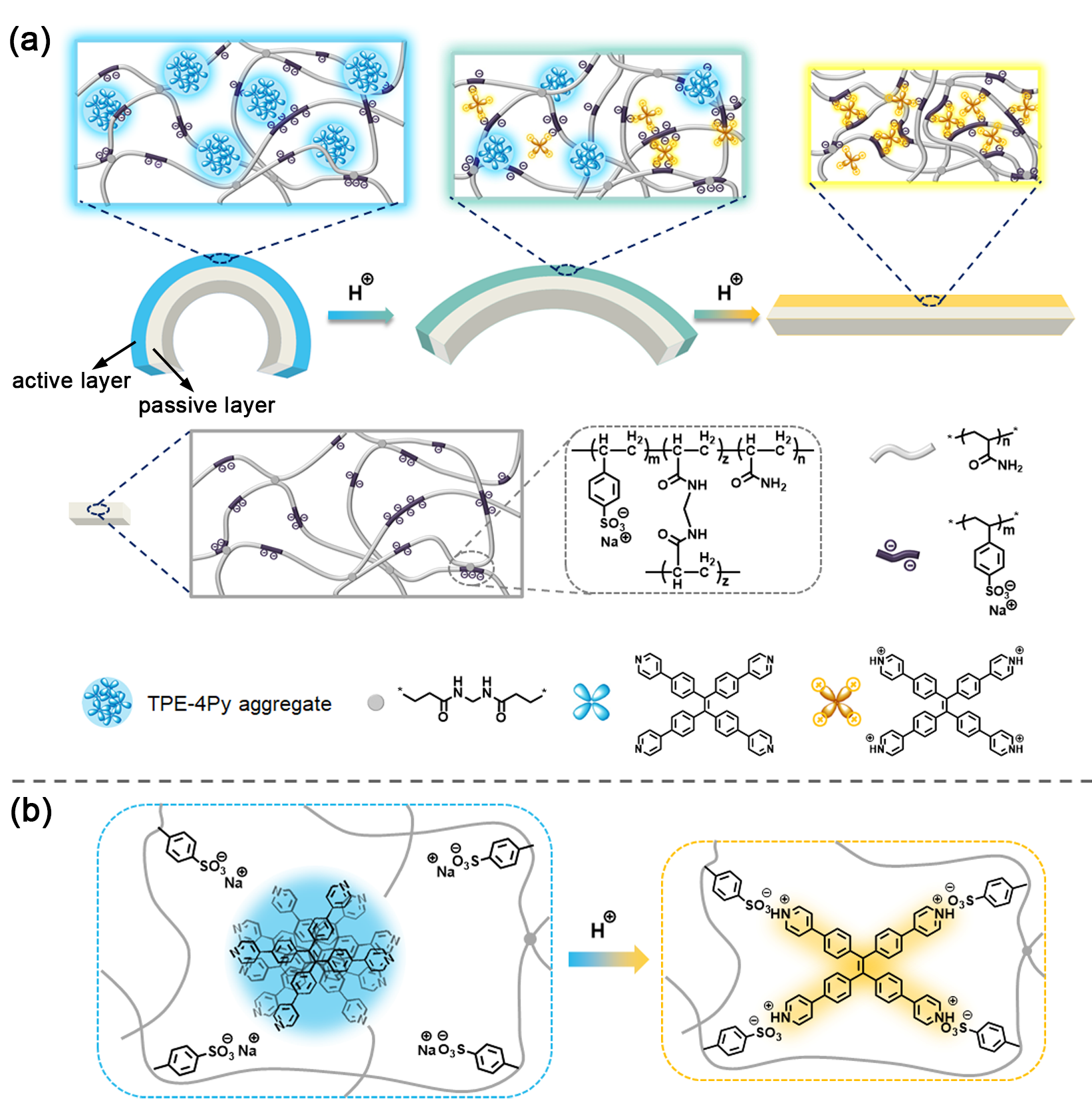 圖1. (a) 基于TPE-4Py/PAS的雙層水凝膠驅(qū)動器在pH刺激下同時改變熒光顏色、強度和形狀的示意圖;(b) 當驅(qū)動器所處環(huán)境酸化時,在活性層聚集體中的TPE-4Py質(zhì)子化并于PAS鏈形成靜電相互作用。