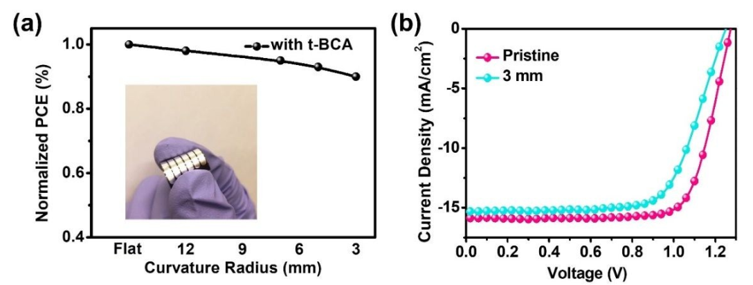 圖6. (a)柔性器件的PCE隨彎曲半徑增大(不彎曲、12 mm、7 mm、5 mm、3 mm)的變化。插圖為PSCs的實物圖像。(b)彎曲半徑為3 mm的柔性PSCs彎曲1000次前后的J-V曲線。